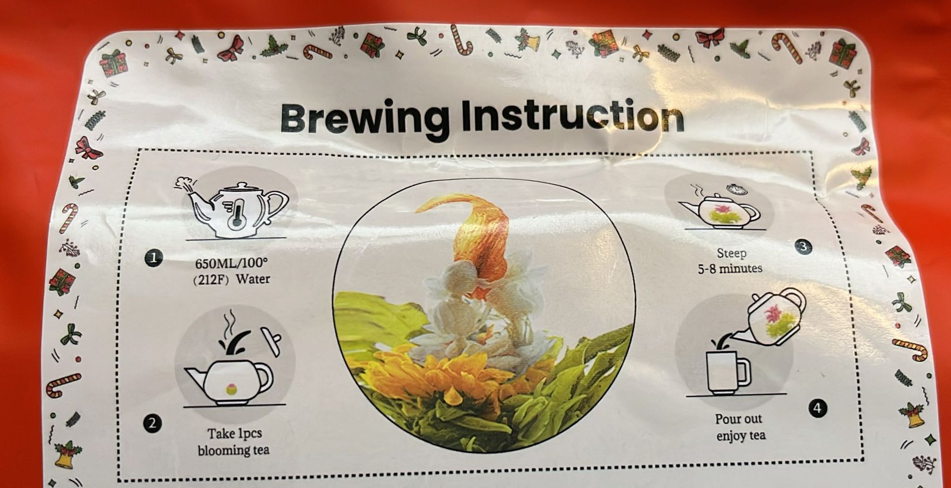 1 Blooming Tea in einer Teekanne mit 650 ml kochendem Wasser aufgießen und 5-8 Minuten ziehen lassen. Hergestellt in China, Fujian China Mindestens haltbar bis: 26.05.2027 |