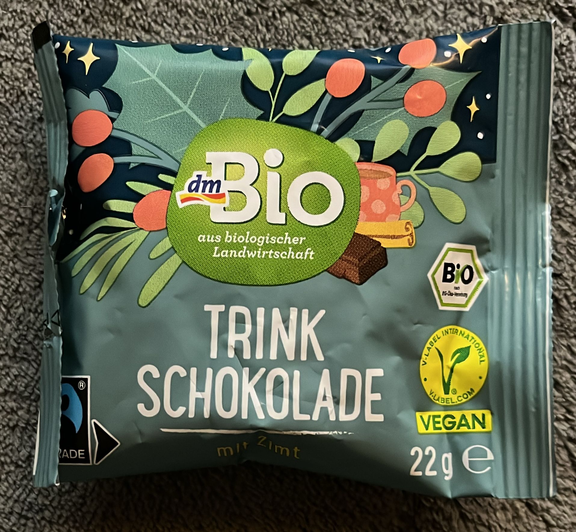 ![]() | Zutaten: Rohrohrzucker*, 42% Kakaopulver*, 2% Zimt*. *aus biologischer Landwirtschaft Zubereitung Beutelinhalt in ca. 140ml heiße Milch oder Pflanzendrink (max. 80°C) einrühren. Trocken und vor Wärme geschützt lagern. Hersteller: dm-drogerie markt GmbH + Co. KG Am dm-Platz 1 76227 Karlsruhe service@dm.de Hergestellt in: Österreich Rohrohrzucker, Kakaopulver und Zimt aus Nicht-EU Mindestens haltbar bis: siehe Aufdruck auf der Verpackung |